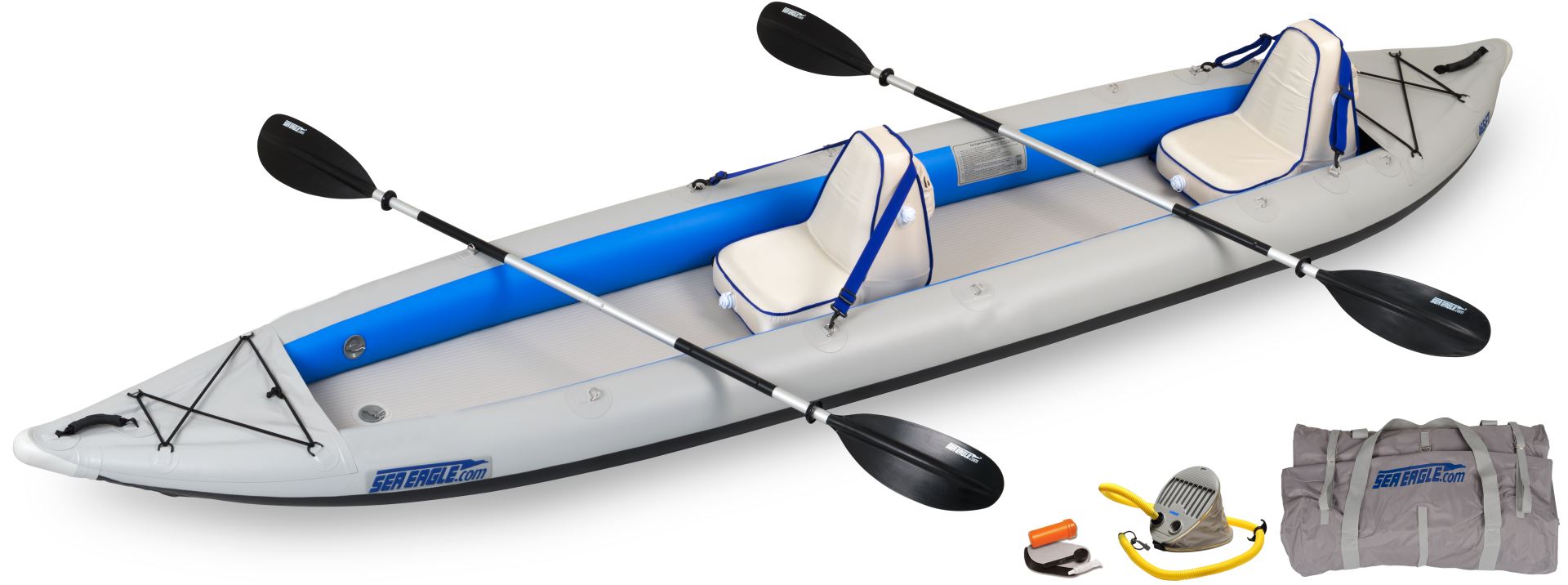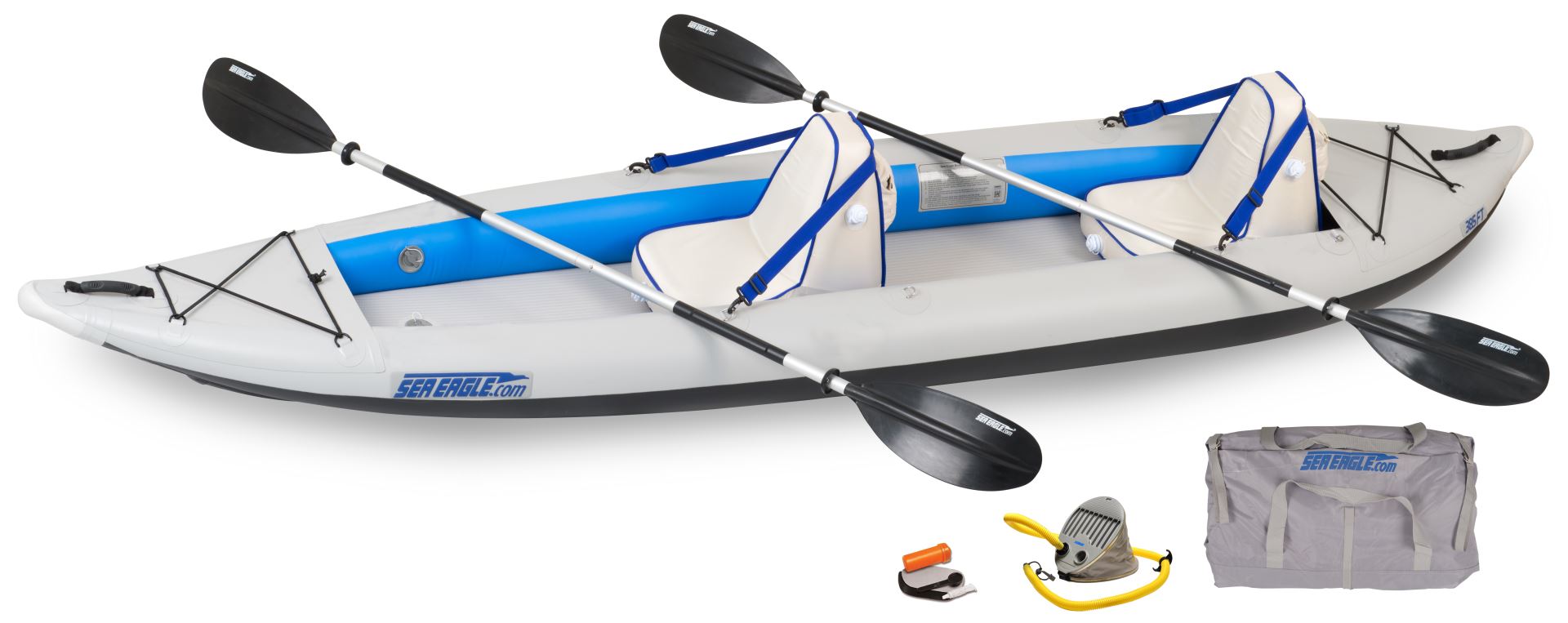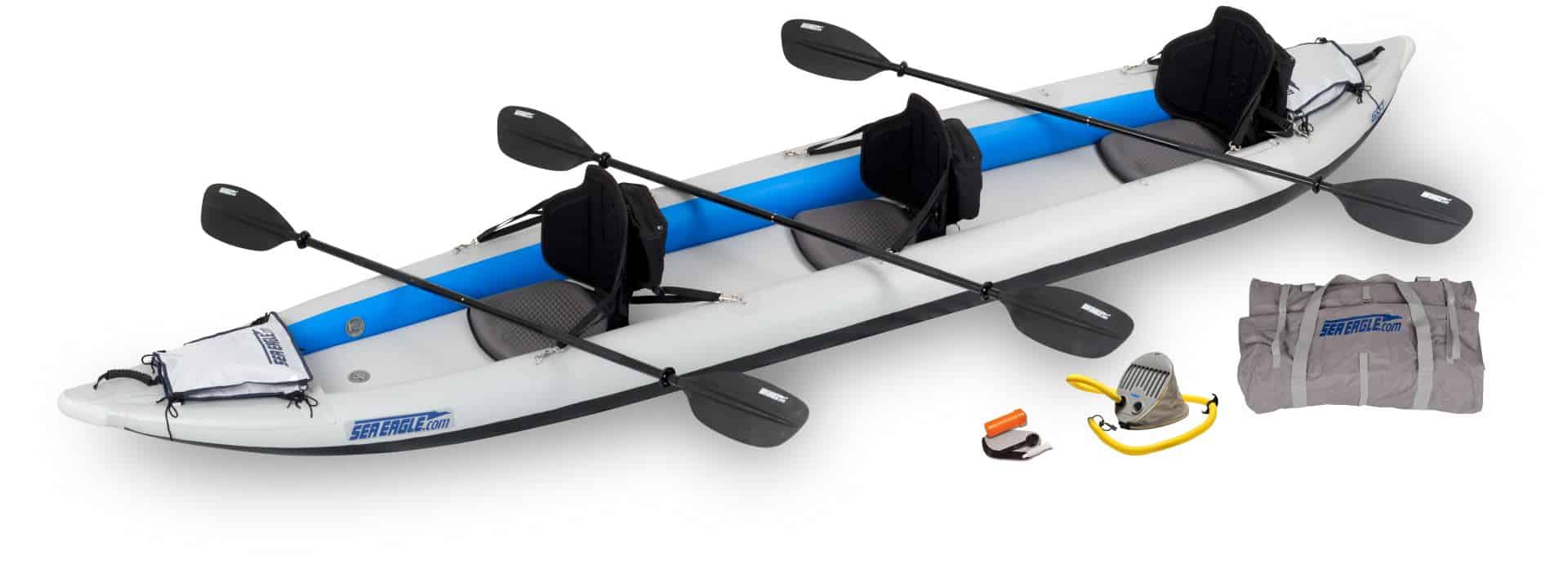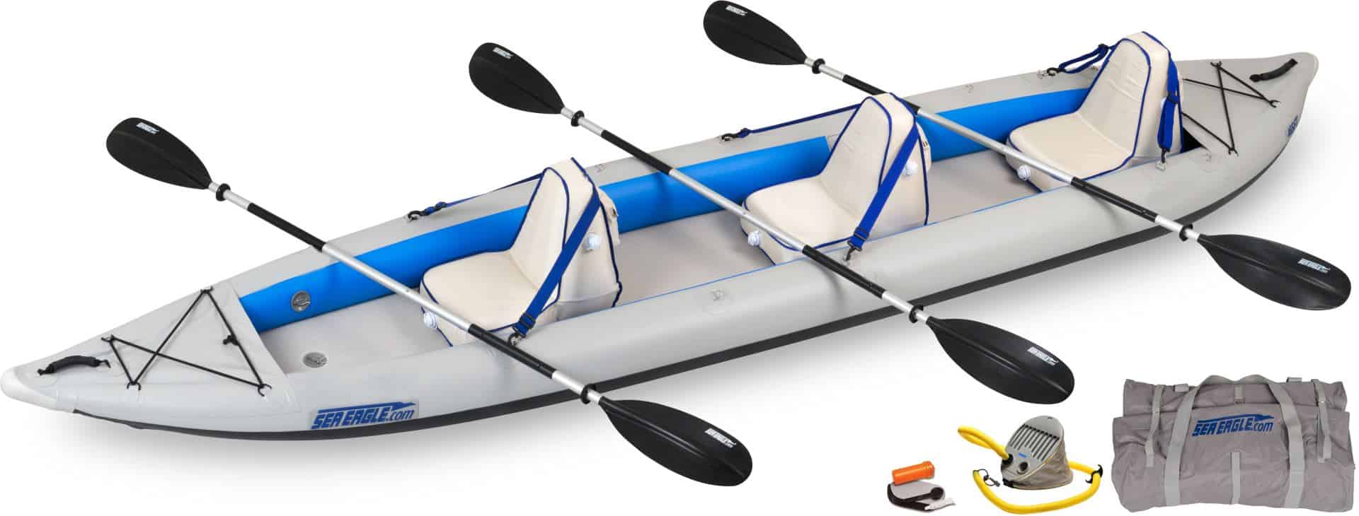 * Includes 3 High back Seats and upgraded top end, ultra-light, Carbon-Fiber Paddles & Two Kayak Stow Bags For Dry Storage.