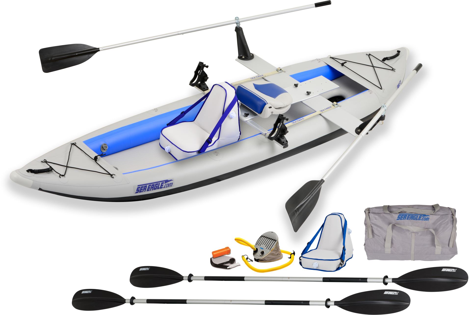 * Includes a unique Row Set (including additional paddles) for Extra thrust & two Scotty® Rod holders & Two Kayak Stow Bags For Dry Storage.
